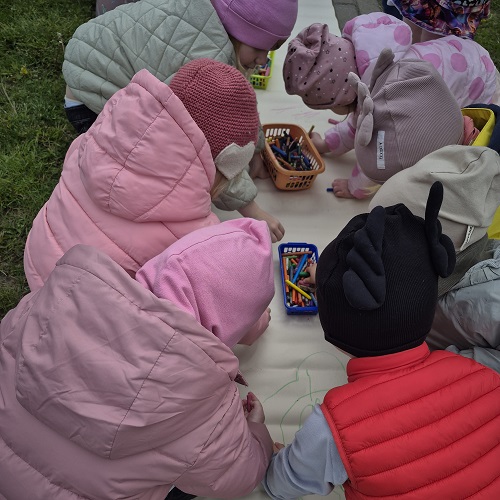 Po pokalbio visi vaikai lauke ėmėsi kūrybinio darbo – šešios darželio grupės kartu piešė du didžiulius bendrus gerumo piešinius. Šie piešiniai dabar eksponuojami mūsų lauko klasėje. Kviečiame visus – tėvelius, draugus, bendruomenės narius – užeiti, pažiūrėti ir prisiliesti prie gerumo, pažvelgiant į jį vaikų akimis ir širdimis.