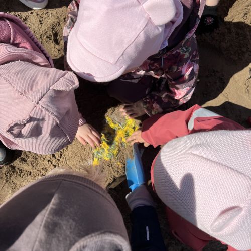 Pirmąją gegužės savaitę vaikai susipažino su gėlių įvairove, įvairiais pavasariniais darbais. Stebėjo darželio kieme esančiuose gėlynuose augančius augaliukus, panašių ieškojo knygose ir enciklopedijose. O smagiausia buvo lauke, smėlio dėžėse iš prisirinktų gėlių, žolių, lapelių gaminti slaptus sekretus.