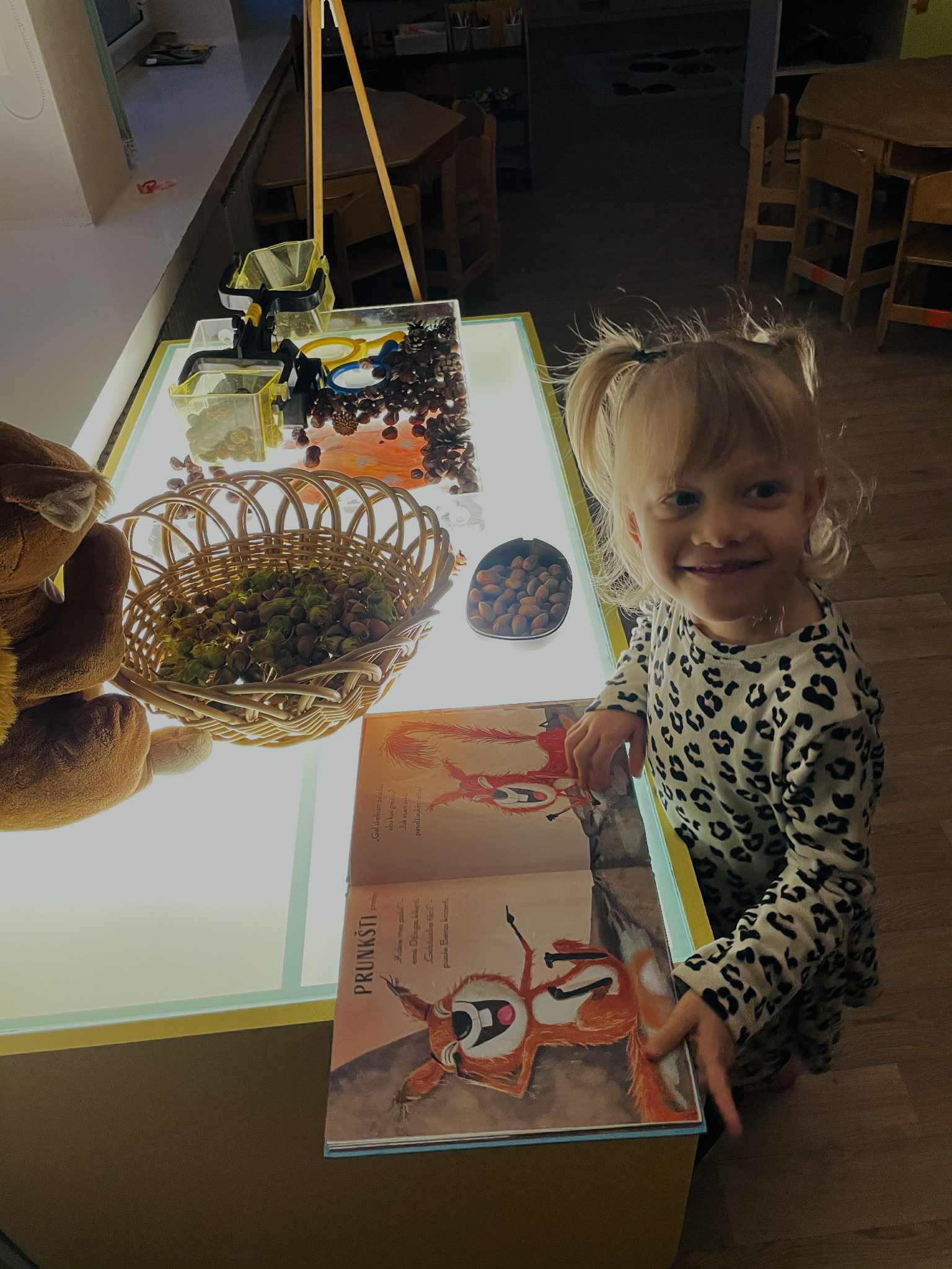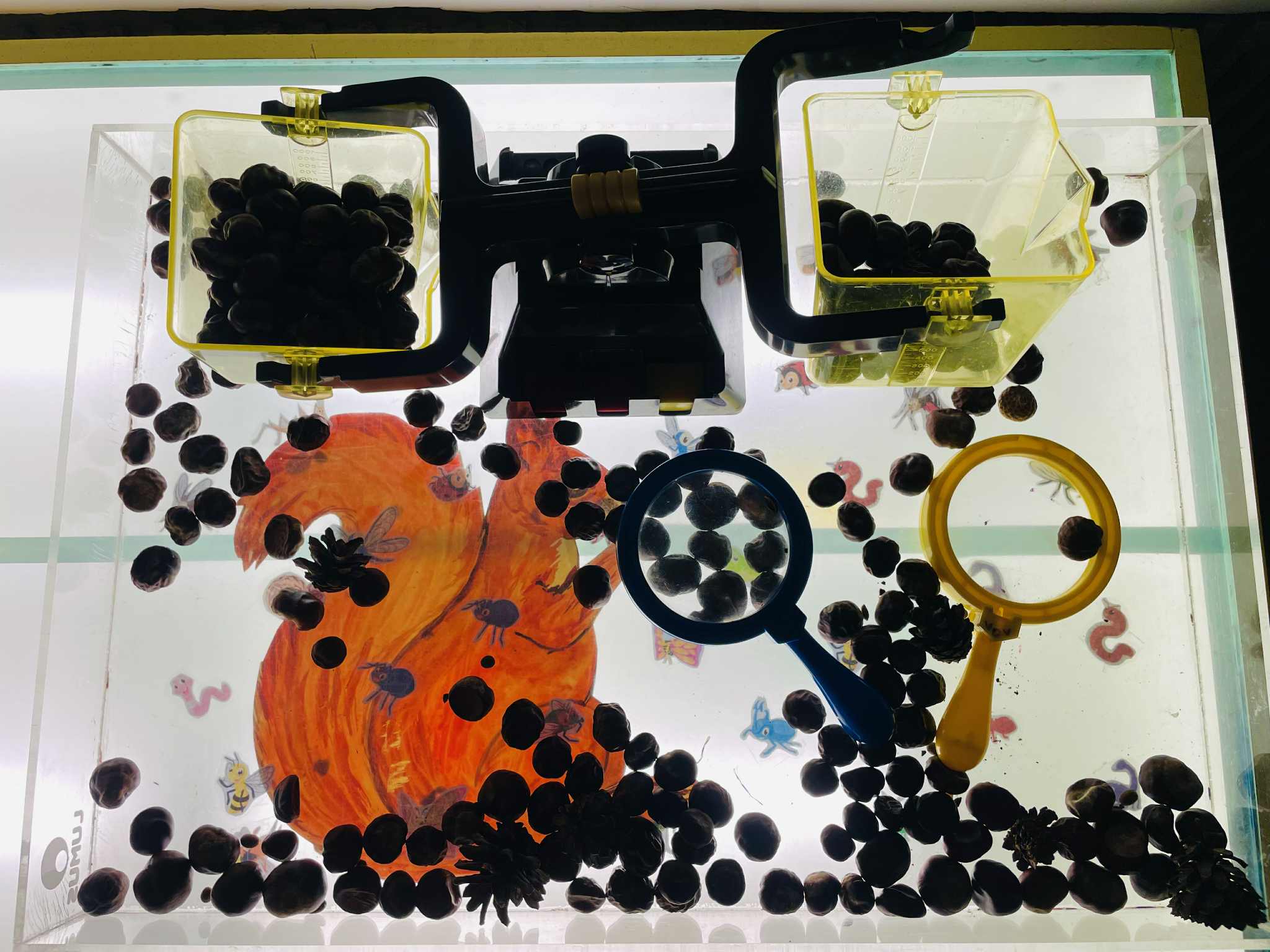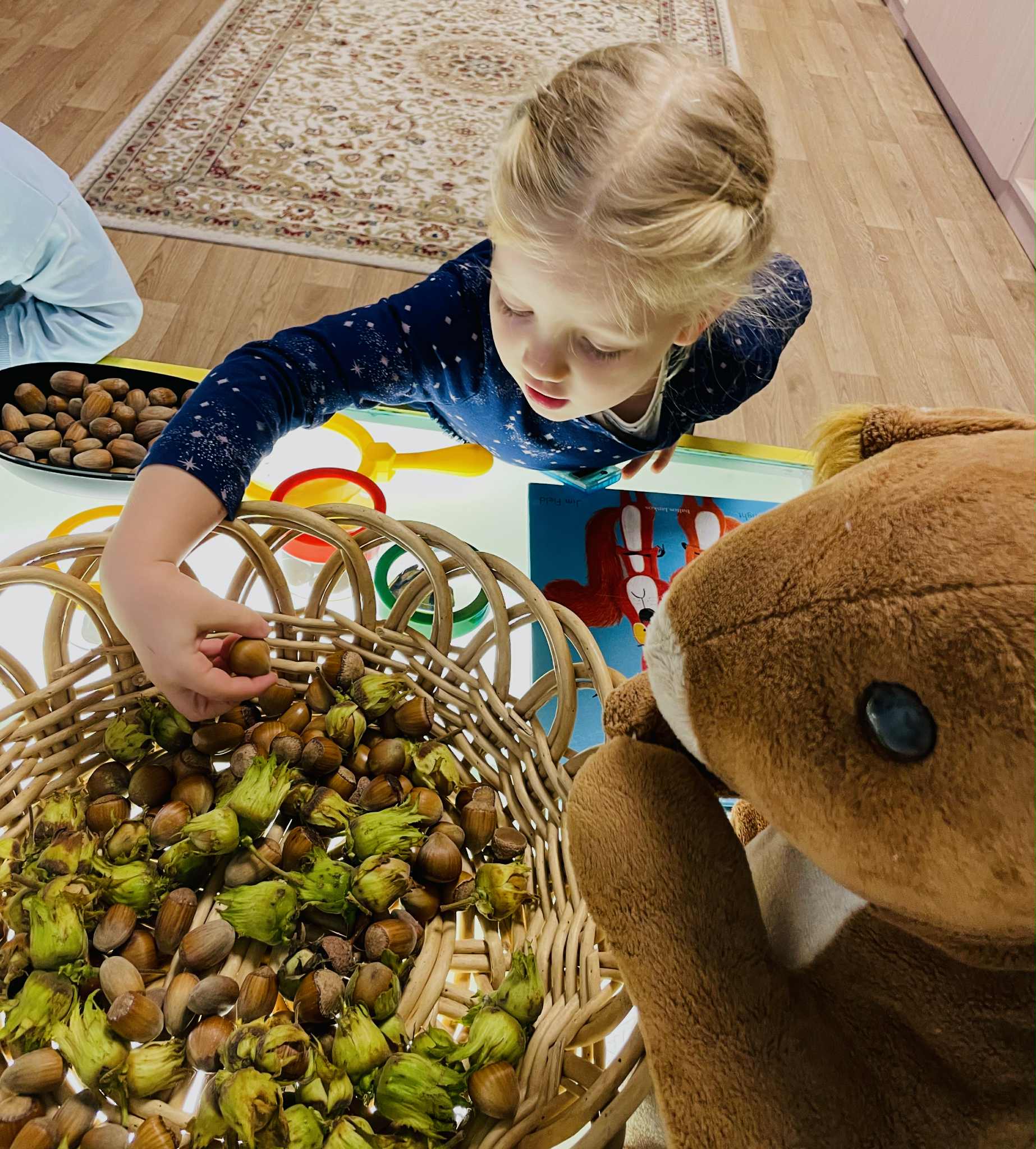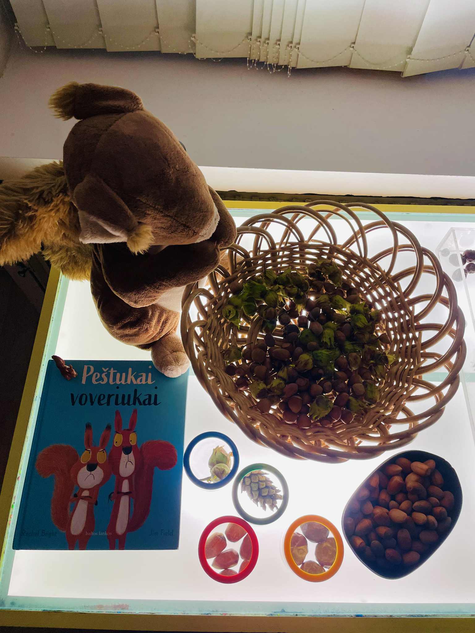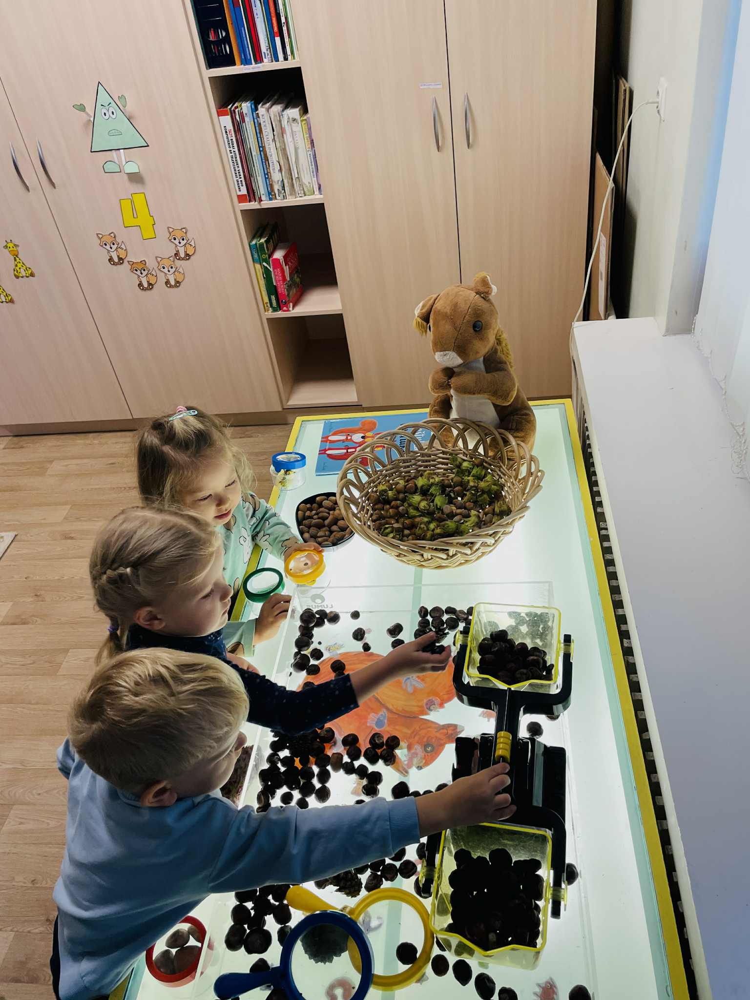 Kartu su mokytojomis vaikai stebėjo voverę ir jos aplinką, lygino riešutus ir giles, tyrinėjo jų formas, svorį, spalvas bei sužinojo, kaip šie gamtos turtai susiję su gyvūnų gyvenimu.