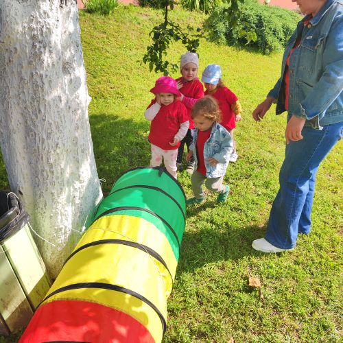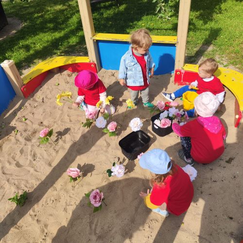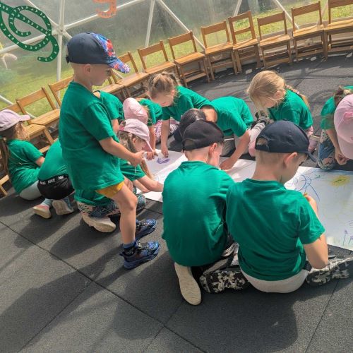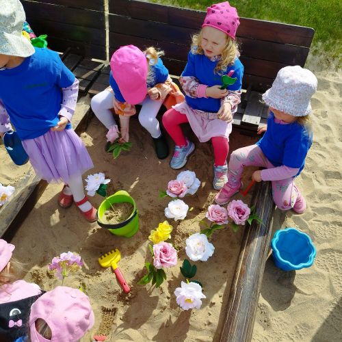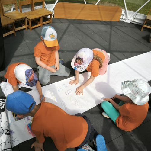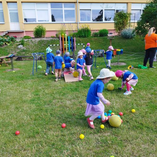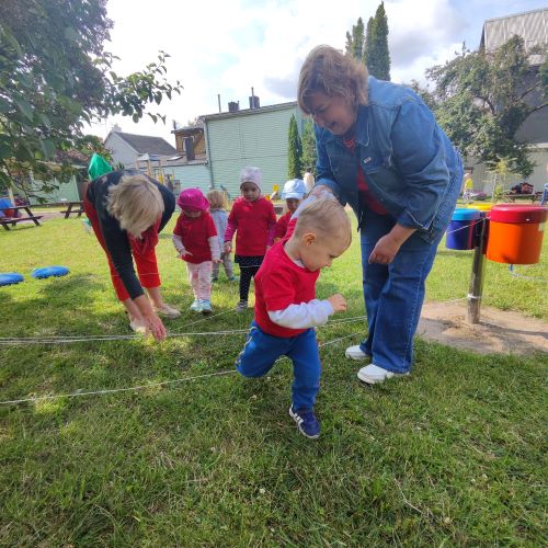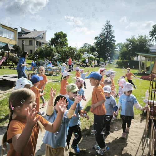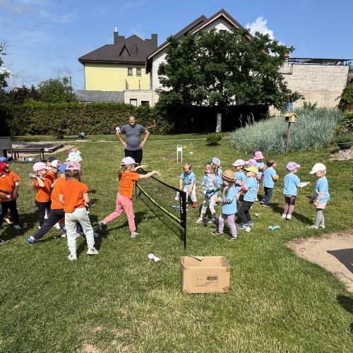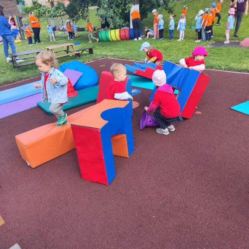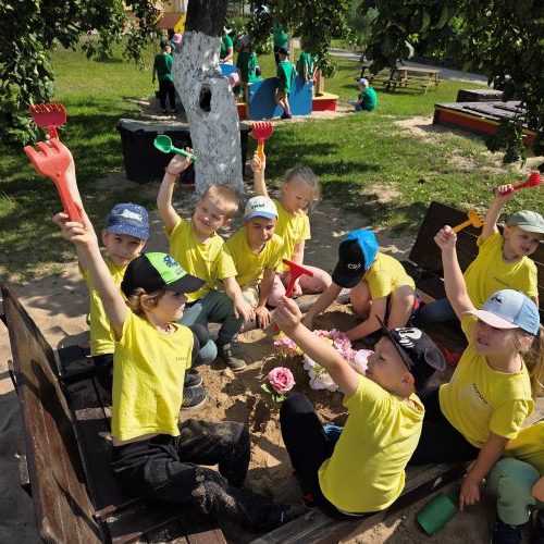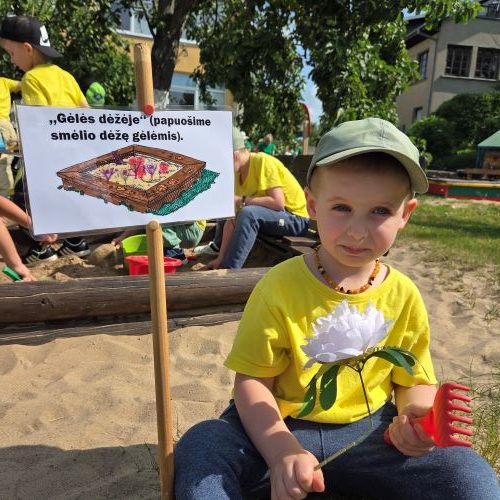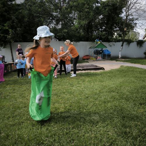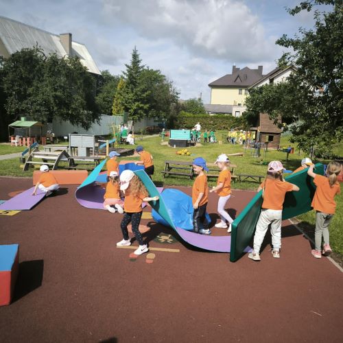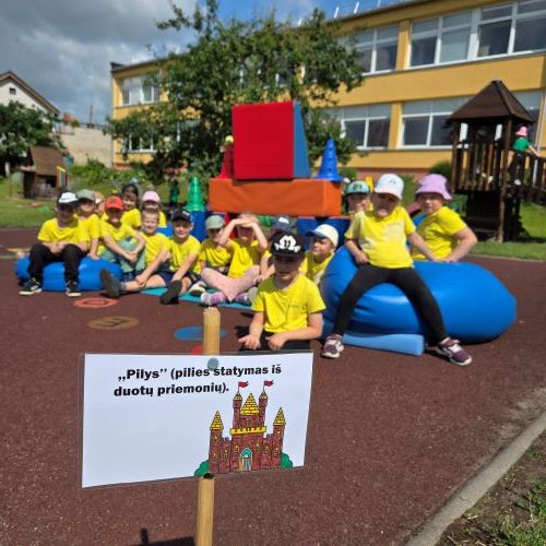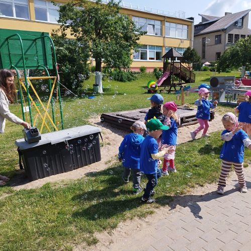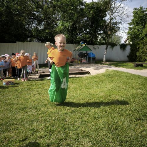 Vaikai piešė ant ilgo tapeto – ten gimė tikros vasariškos meno parodos! Šokinėjome maišais kaip zuikučiai, lėkėme per kliūčių ruožą kaip tikri nuotykių ieškotojai. Gaudėme muilo burbulus, statėme minkštų kaladėlių pilis, sodinome gėles smėlio dėžėje – viskas kvepėjo vasara!